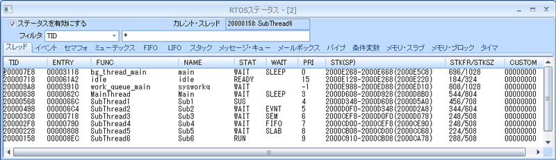 スレッドの実行状態や待ち要因、イベント、セマフォなど各種ステータスを一覧で表示します。