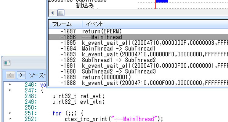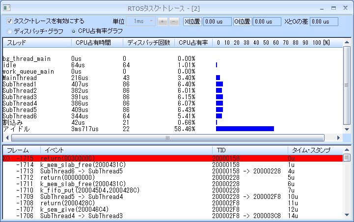 スレッドの状態遷移をグラフィカルに表示して、時間軸とともにスレッドの切り替わりスレッドを一目で確認することができます。 また、Zephyr APIがどのスレッドからどのタイミングで呼び出されているか、データの送受信が正しく行われているかなども簡単に把握できます。